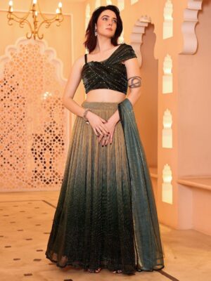 Product Details Green and beige embellished lehenga choli with dupatta, sequinned Green and beige embellished unstitched blouse, has a square